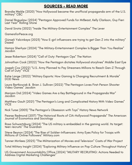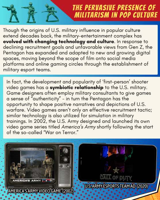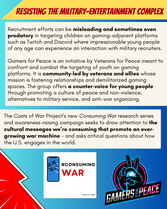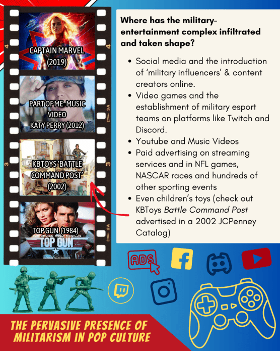 Pro-war and pro-military propaganda have infiltrated a wide variety of entertainment spaces – including (but not limited to) movies, television shows, video games, sporting events, social media, and even children’s toys.