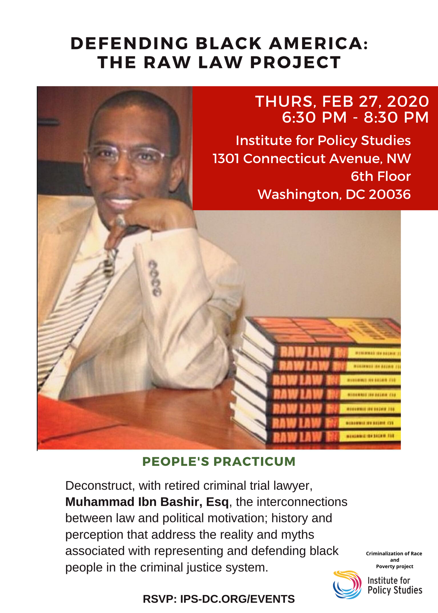 For Black History Month the Institute for Policy Studies' Criminalization of Race and Poverty project hosts Muhammad Ibn Bashir, Esq. for a fast paced, interactive people's practicum on how to defend Black people in a criminal justice setting. Attorney Bashir will explore and explain Criminal Justice within the context of history, politics, social indoctrination and prevailing pathologies by the use of historic, contemporary and personal anecdotes, case law, legislative intent and actual cases.