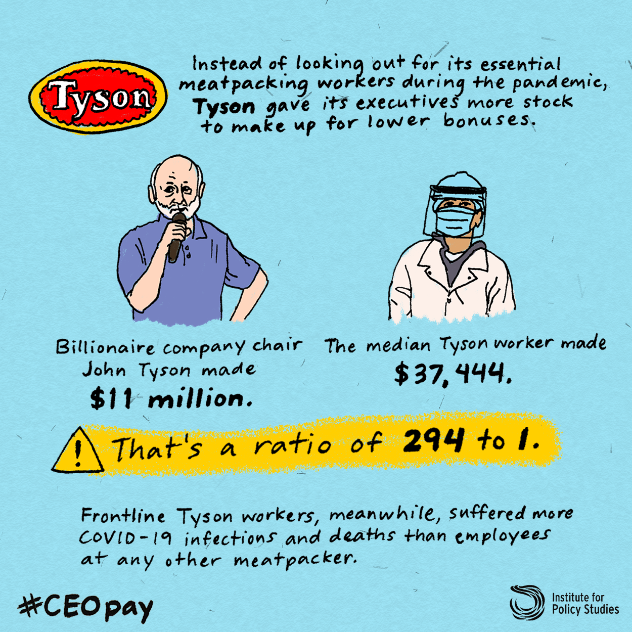 CEO Noel White wound up with total compensation of nearly $11 million — 294 times as much as typical worker pay of $37,444. John Tyson, the heir and grandson of the company founder, watched his personal wealth increase 72 percent during the pandemic — to $2.6 billion.