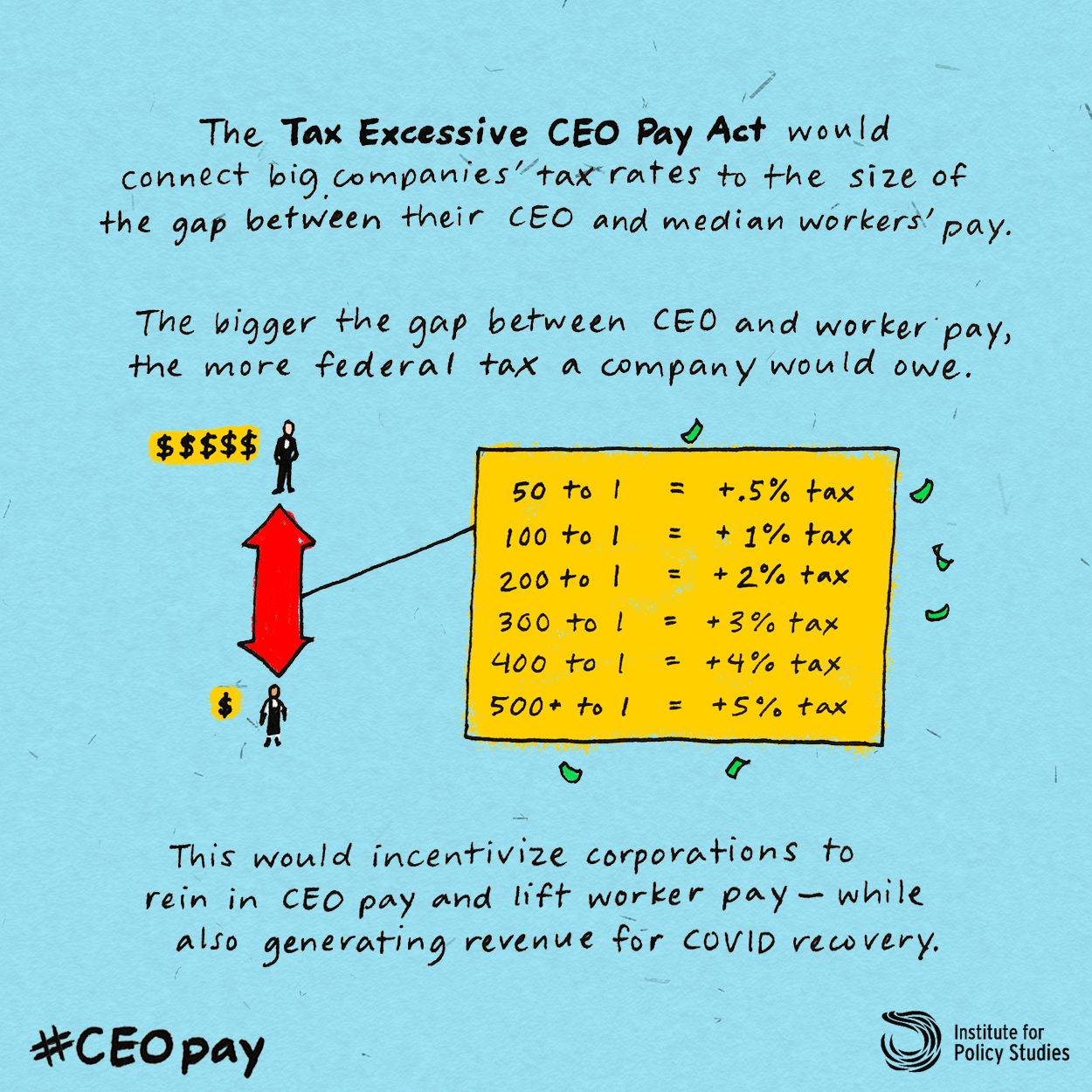 Taxing extreme pay gaps could generate significant revenue for a more equitable COVID recovery. The Tax Excessive CEO Pay Act would incentivize corporations to narrow their divides through graduated tax rate increases based on the size of their pay gaps. Corporations with pay gaps between a company’s highest-paid executive and median worker of less than 50 to 1 would owe no extra taxes under this bill. The largest tax increase, of five percentage points, would apply to pay ratios of more than 500 to 1. If this bill had been in place in 2020: