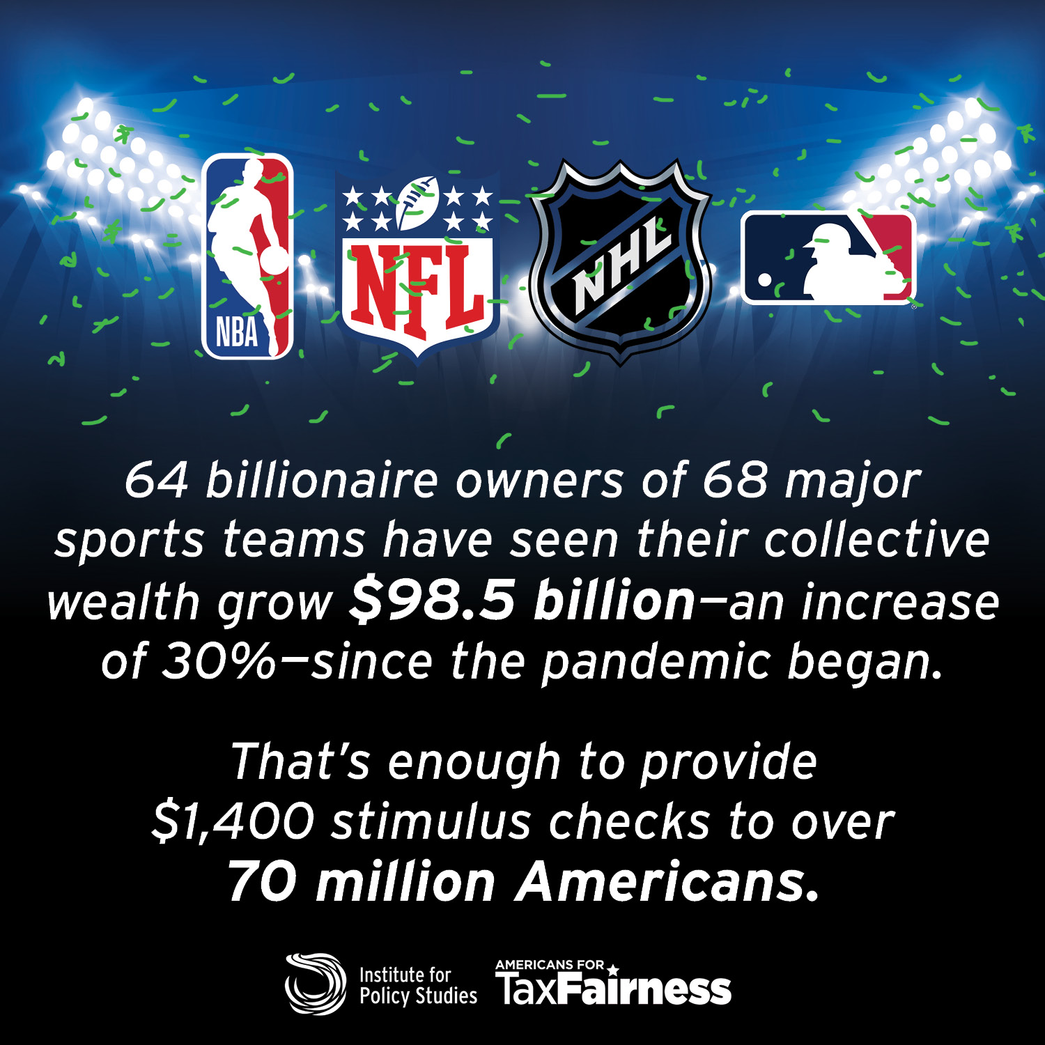 Since the start of the pandemic lockdowns last year, pro sports teams have laid off large numbers of stadium workers and staff. And millions of sports fans have suffered job loss, sickness, and death. Yet these 64 billionaire sports barons have seen their wealth grow by over $98.5 billion — about what it would cost to send a $1,400 stimulus check to nearly half of all eligible Americans.