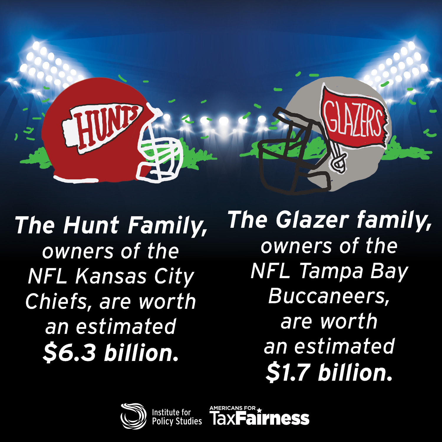 Sixty U.S. billionaires — roughly one in ten of the country’s total billionaires — own one or more major league professional sports teams. Among these billionaires owners are the Hunt family, which owns the Kansas City Chiefs, and the Glazer family, which owns the Tampa Bay Buccaneers (Three teams are owned by Canadians and one by a German).