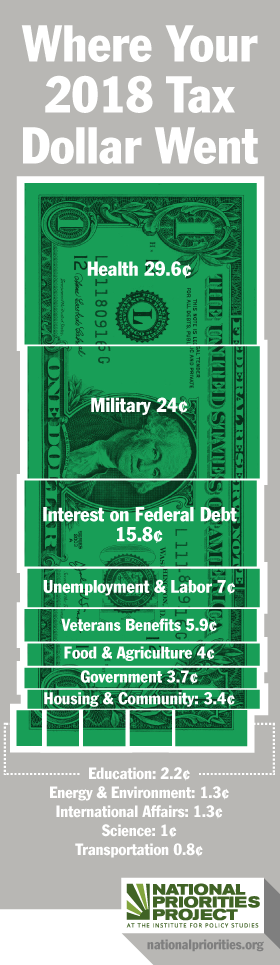 Did you know that with your tax money, the government spends more on nuclear weapons than on the Environmental Protection Agency, or the Children’s Health Insurance Program? Or that health care is the biggest item on your tax receipt? Have you thought about how spending on disaster relief compares to spending on agencies designed to curb the climate change that accelerates those disasters? Download our fact sheet for some surprising 2019 Tax Day facts.