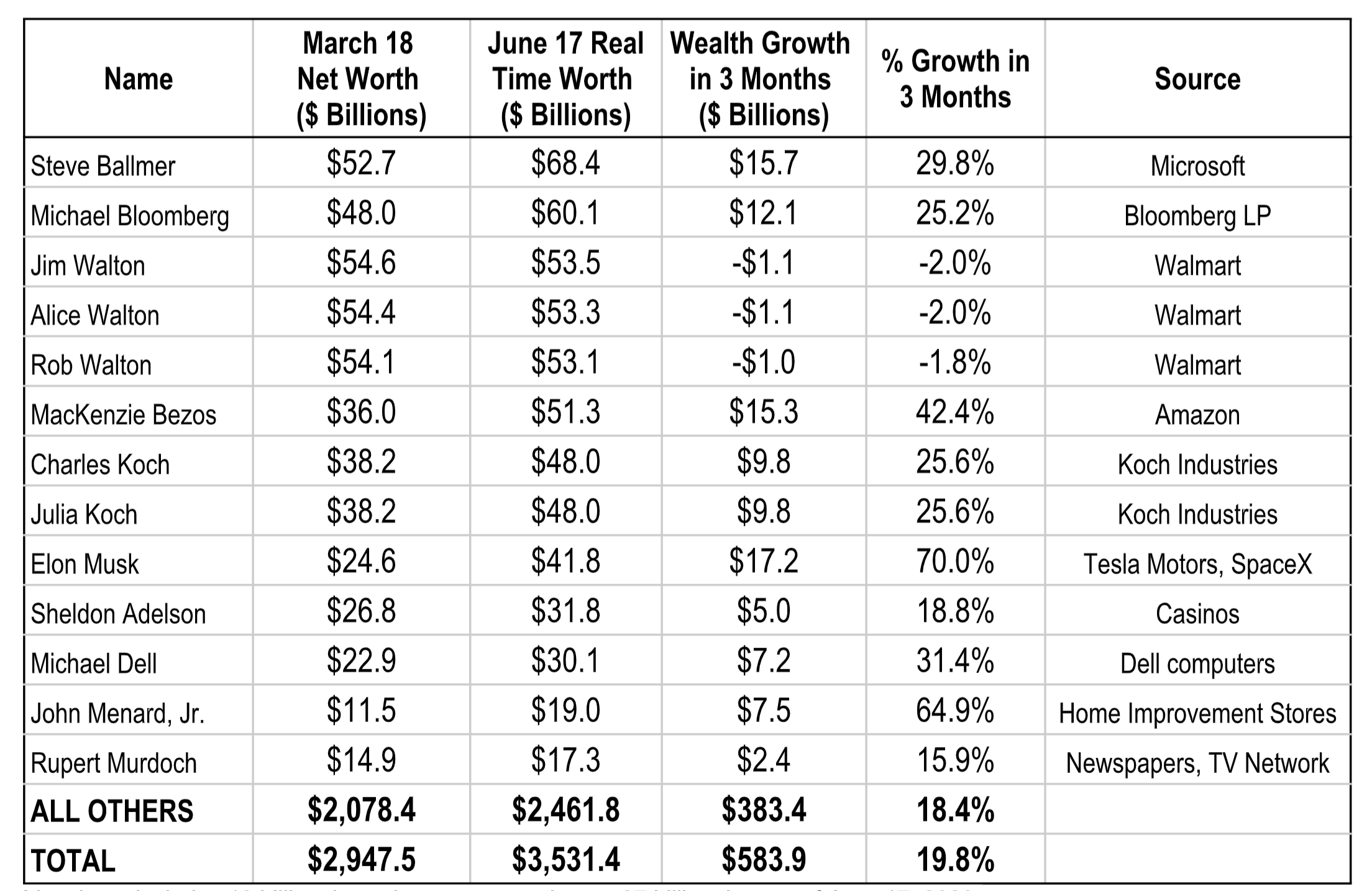 Wealth growth of other select billionaires in the top 30 on the Forbes June 17 list is below.